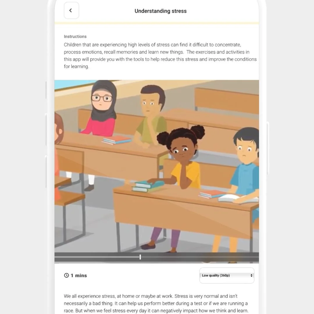 Through guided learning with animated videos, teachers and caregivers can build knowledge through a gradual series of course materials and practical relaxation exercises for use in the classroom or at home.